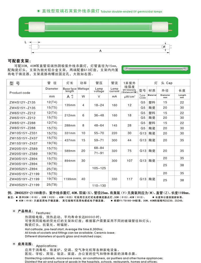 紫外線殺菌消毒燈管,功率有20W、30W、40W三種。